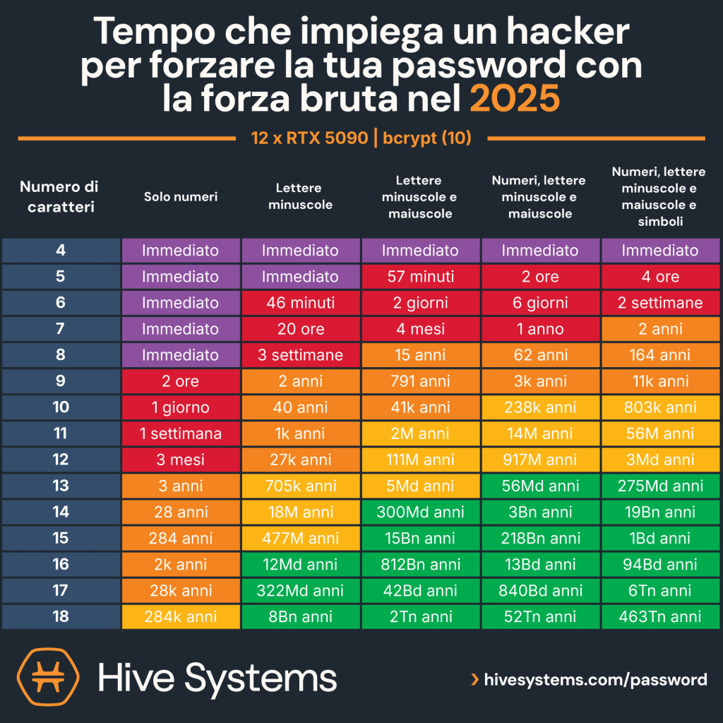Nel 2025 un hacker può forzare una password da 5 caratteri con maiuscole e minuscole in meno di un’ora.