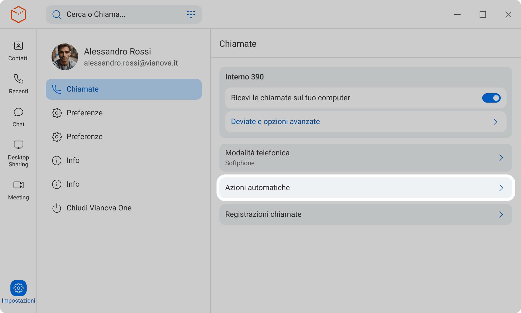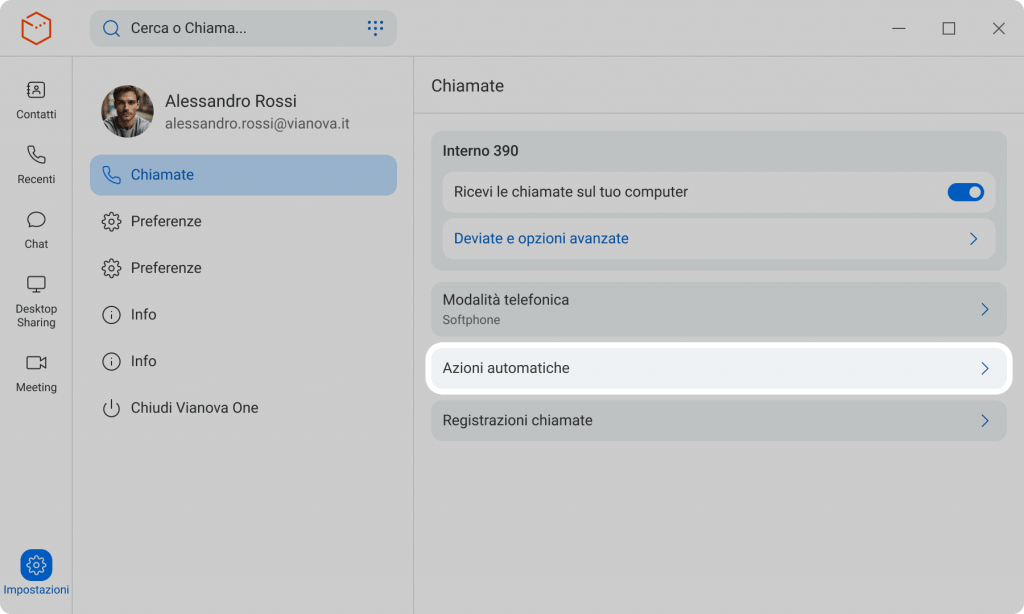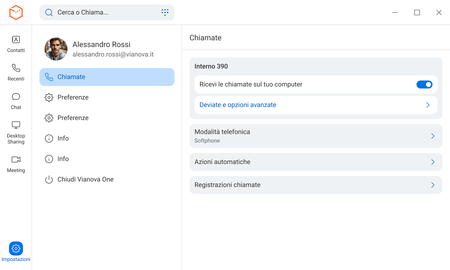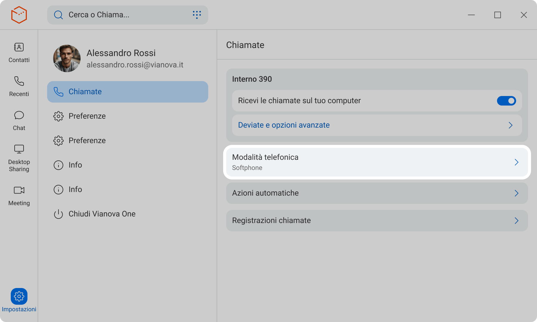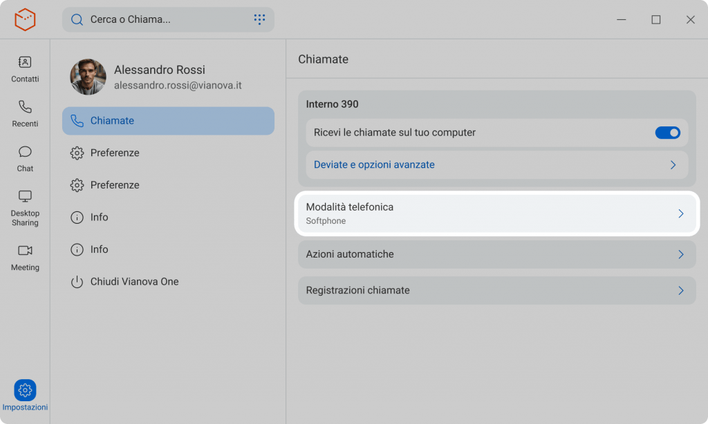 - La modalità Softphone permette di effettuare e ricevere chiamate direttamente dal tuo PC. Questa modalità è impostata di default al primo avvio di Vianova One.